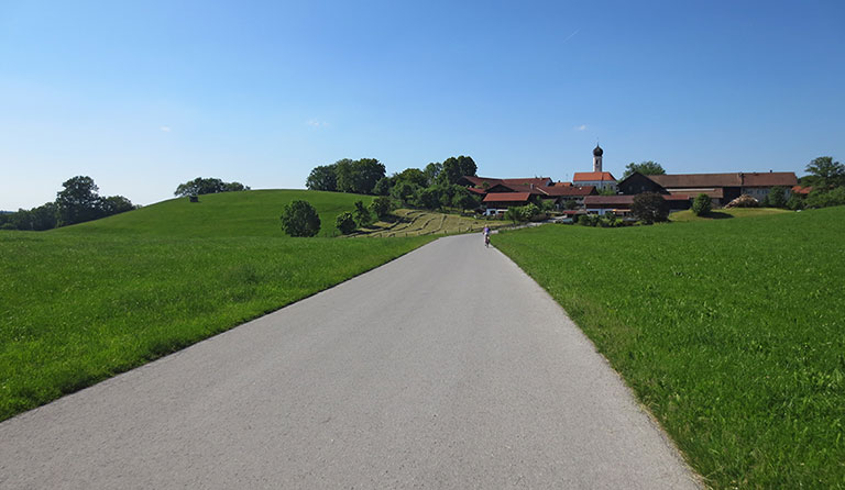 Nun biegen wir linkshaltend in die Landstraße ein und erreichen Kleinhelfendorf. Gleich nach der barocken Pfarrkirche St. Emmeram biegen wir rechts ab und passieren die sehenswerte Kirche. Nach einer Linkskurve halten wir uns bei der zweiten Gelegenheit schräg rechts und folgen der Via Julia und dem Mangfall-Radweg über einen Feldweg in nordwestlicher Richtung. Wenig später überqueren wir die Glonner Straße, passieren die Grundschule von Großhelfendorf. Sobald wir die folgende Querstraße erreichen, biegen wir rechts ab und folgen der Graßer Straße nordwärts zu einer weiteren Querstraße. Wir biegen rechts und bei der nächsten gelegenheit gleich wieder links ab. In Kaltenbrunn radeln wir nach links, nach dem Waldstück halten wir uns rechts und fahren hinunter nach Aying.